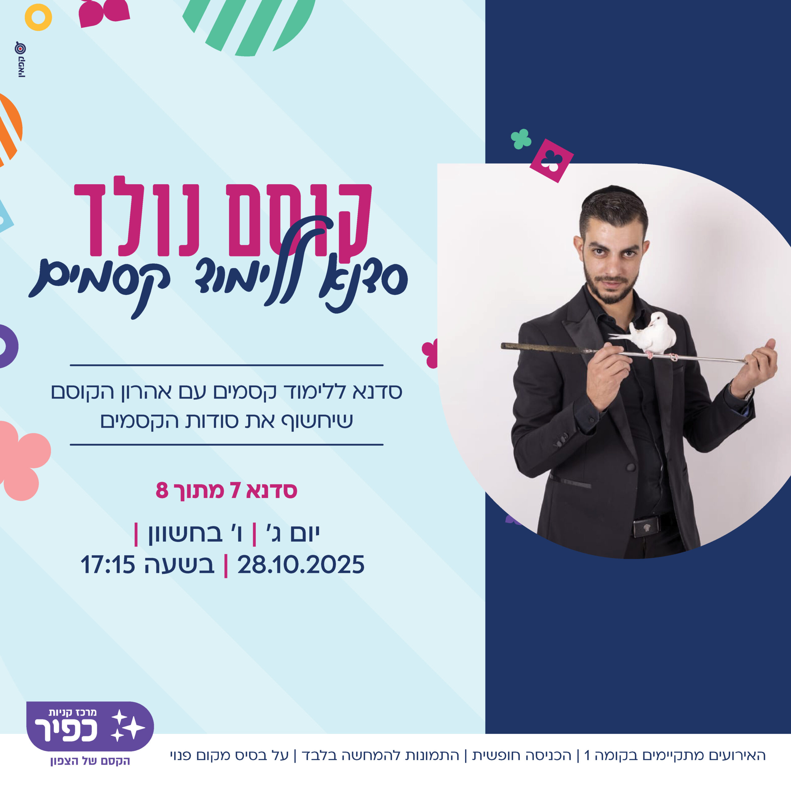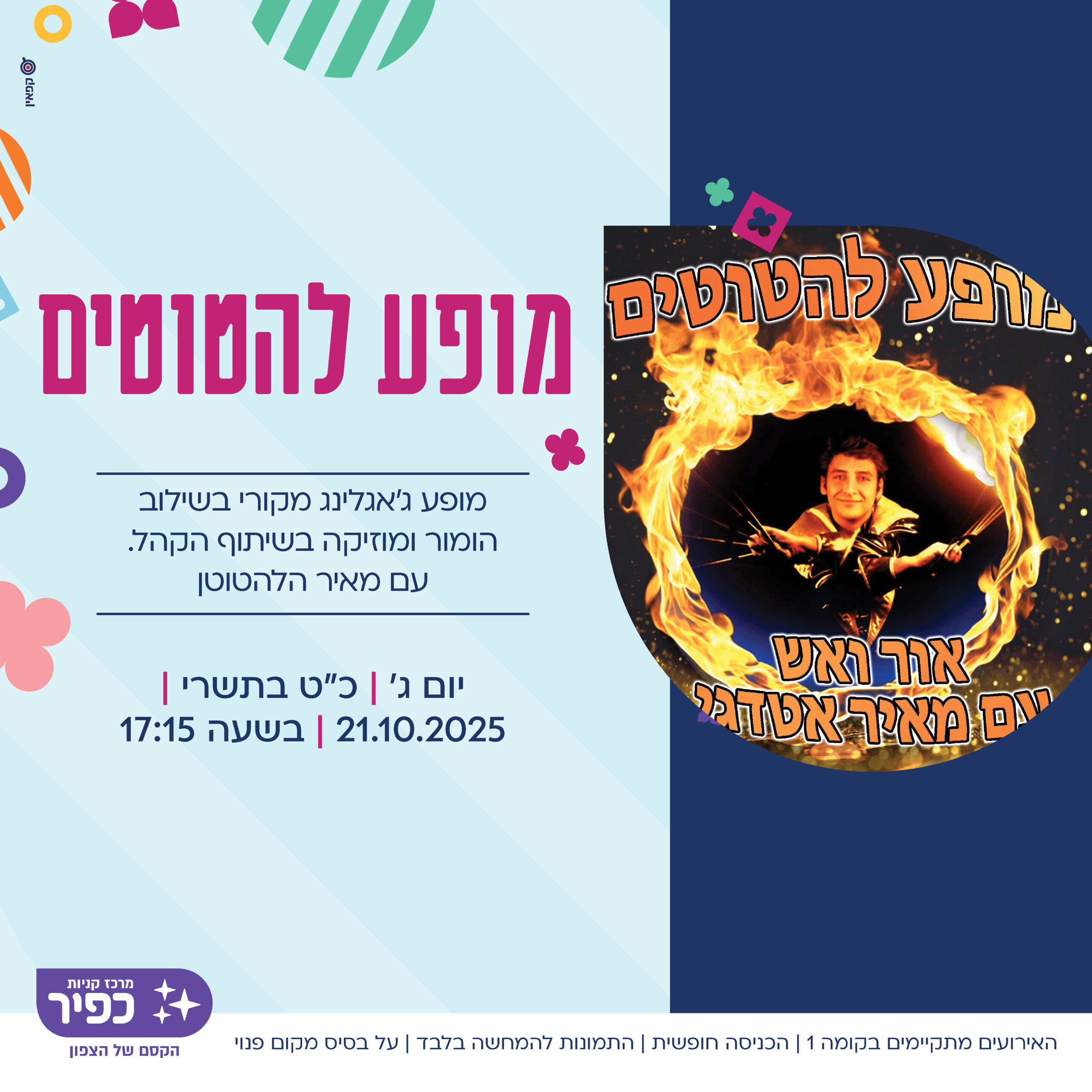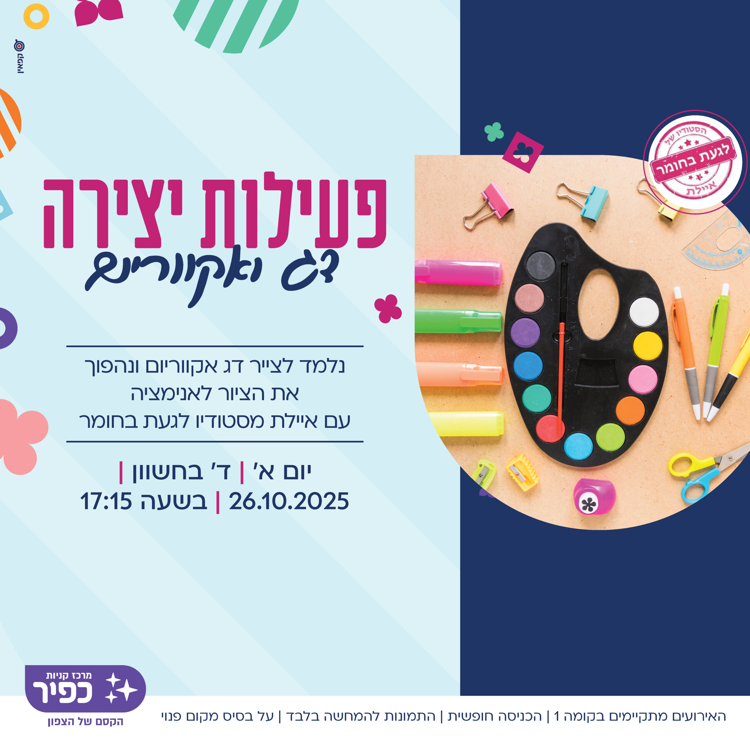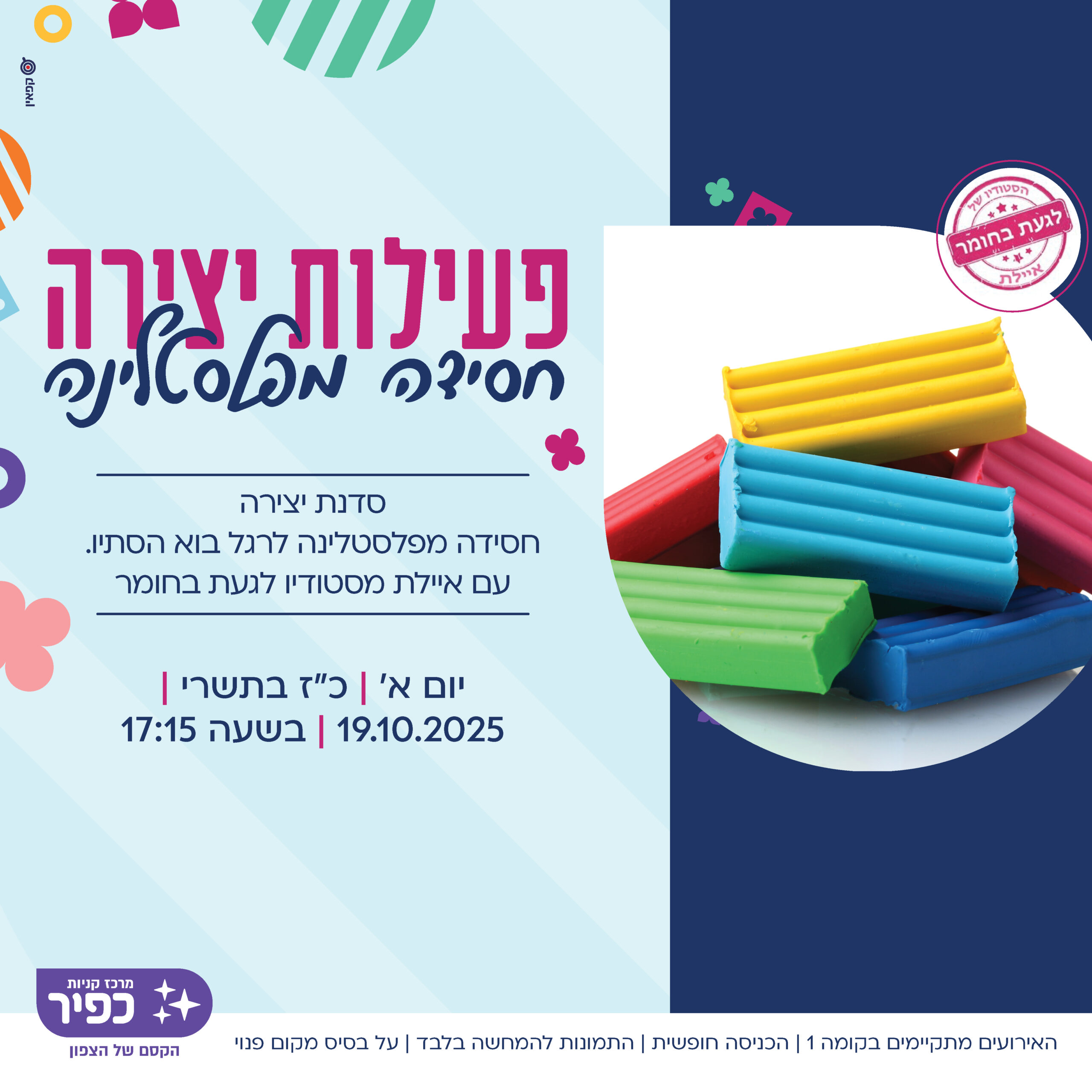 יוצרים חסידה מפלסטלינה 19/10 יום א' 17:15 מופע להטוטים עם מאיר הלהטוטן 21/10 יום ג' 17:15 לומדים לצייר דג באקווריום 26/10 יום א' 17:15 קוסם נולד! סדנא ללימוד קסמים עם אהרון הקוסם 28/10 יום ג' 17:15