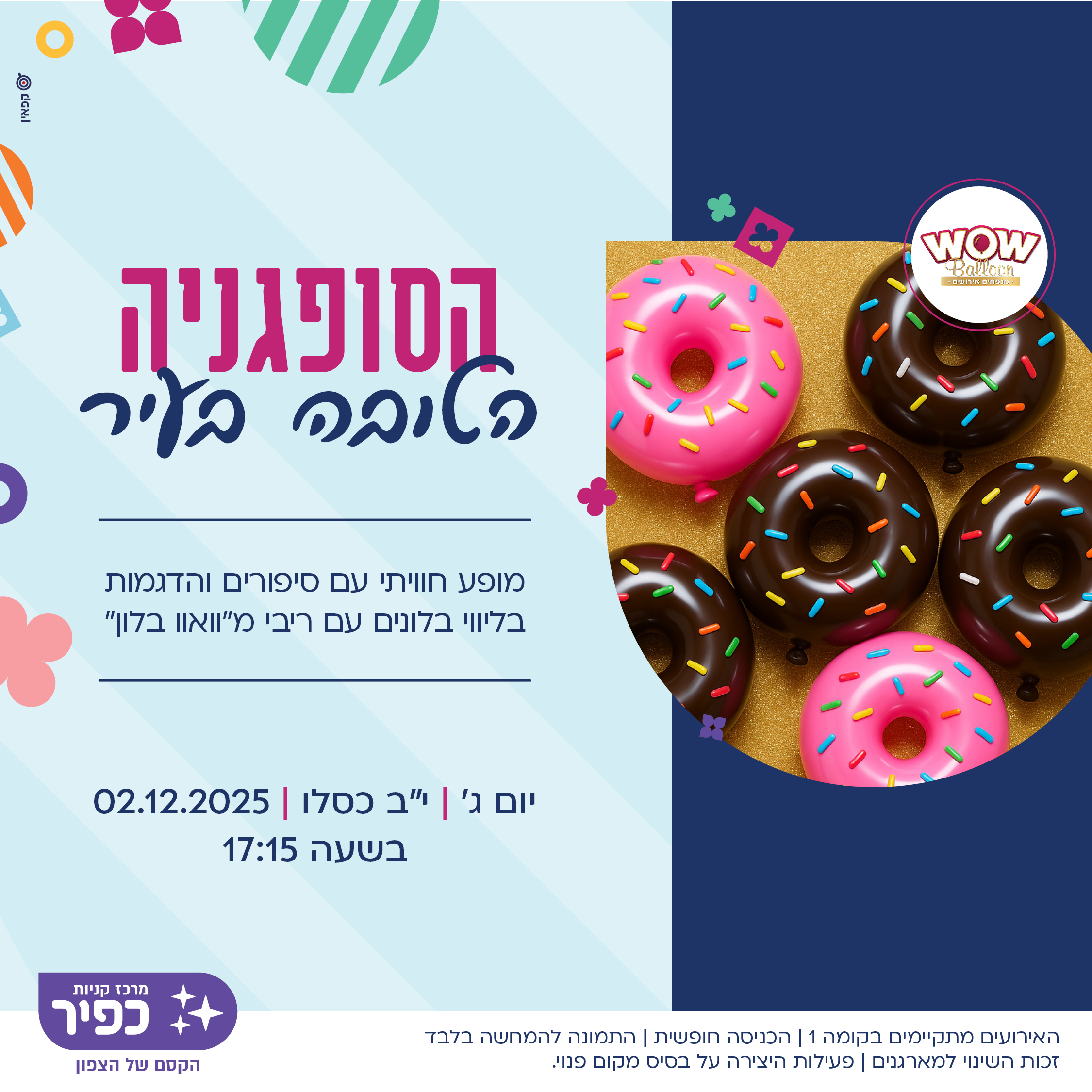 הסופגניה הטובה בעיר :מופע חווייתי עם סיפורים והדגמות בליווי בלונים 02/12 יום ג' 17:15 פעילות יצירה לחנוכה: יצירת סביבון אישי עם איילת 07/12 יום א' 17:15 סדנת קישוט דונאטס ויצירה 09/12 יום ג' 17:15